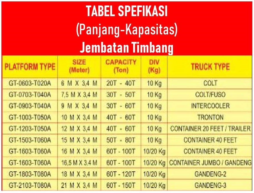 Tentunya setiap bisnis usaha memiliki kebutuhan ukuran dan kapasitas timbangan truk yang berbeda-beda. Karena itu Gewinn Scale menyediakan timbangan truk dengan berbagai pilihan ukuran dan kapasitas berat yang disesuaikan dengan permintaan pembeli.
